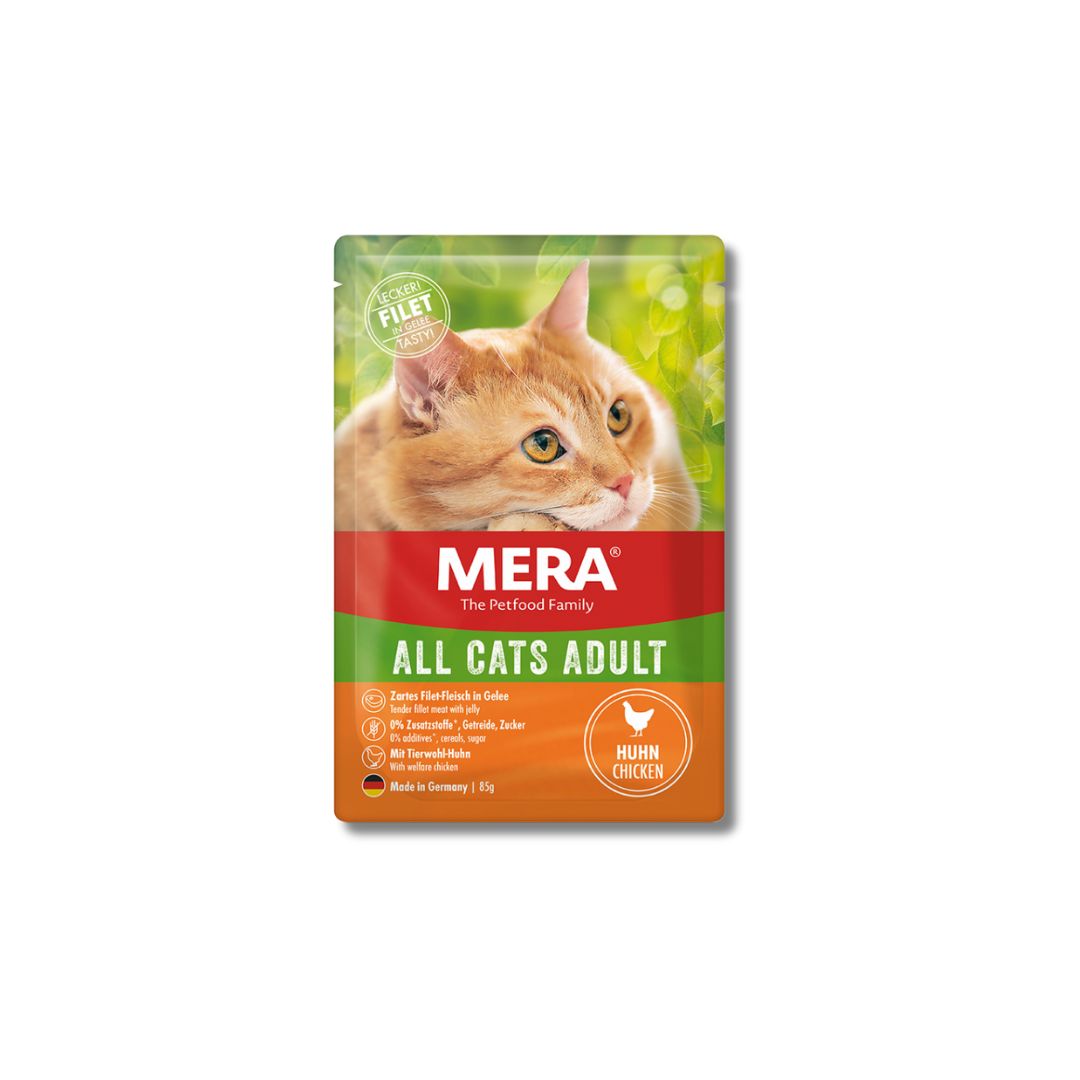 At Pet Master discover the MERA All Cats Adult wet Cat food With Chicken. MERA All Cats Adult Wet Cat Food with Chicken is a premium, grain-free formula designed to meet the unique nutritional needs of adult cats. Made with high-quality chicken as the first ingredient, our wet cat food is packed with protein to support lean muscle mass and overall health.