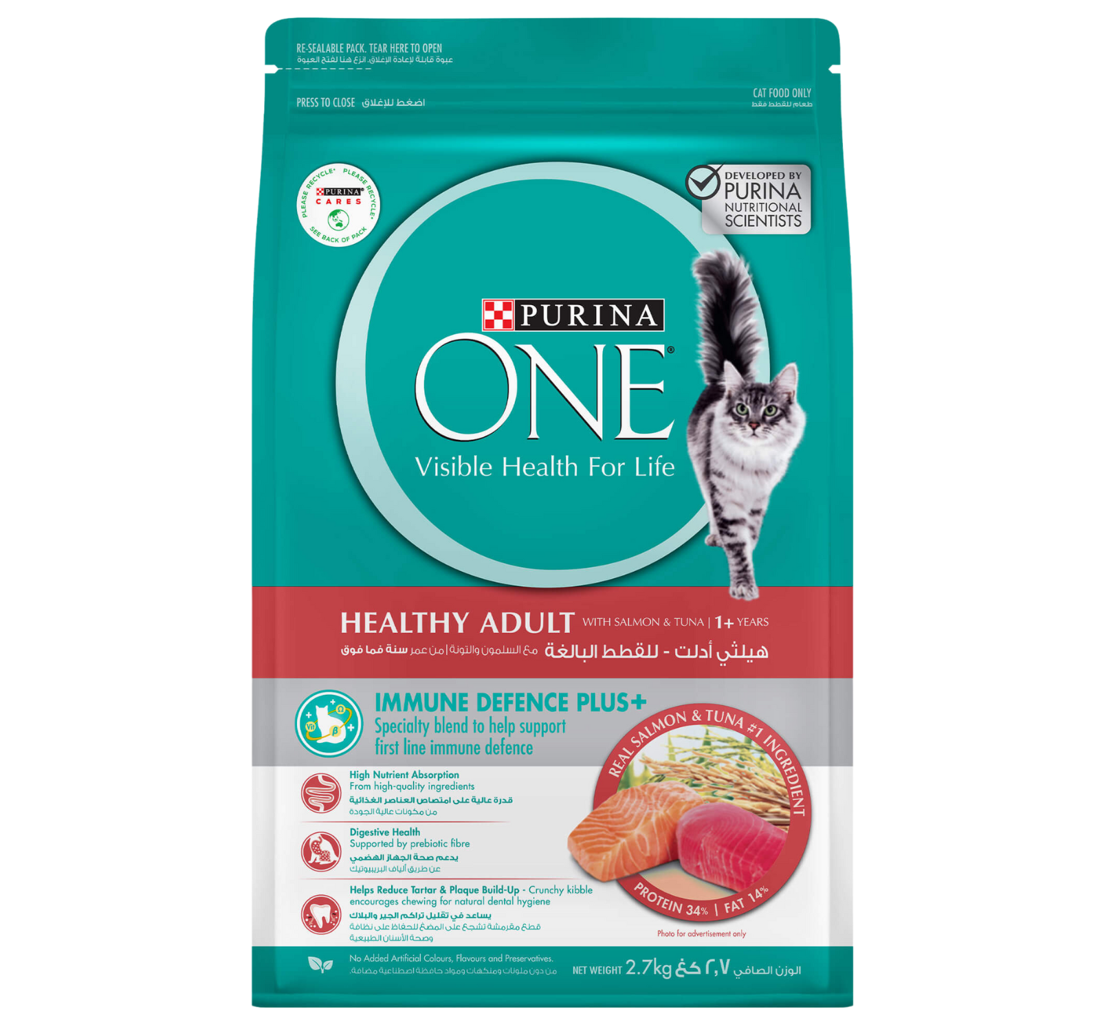 PURINA ONE 1+ Healthy Adult With Salmon And Tuna Dry Cat Food is specially formulated to support the overall health and vitality of adult cats aged 1 year and older. With real salmon and tuna as the main protein sources, this premium cat food provides the taste cats love and the nutrition they need for a long, healthy life.