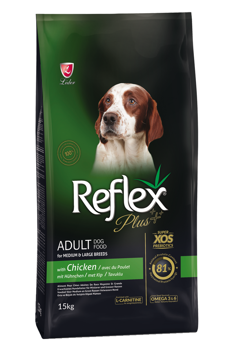 Reflex Plus Adult Dog Food is expertly formulated with real chicken for medium and large breeds. This premium dog food is designed to support your dog's overall health and well-being, providing essential nutrients and promoting strong muscles and bones. Give your furry friend the best with Reflex Plus.
