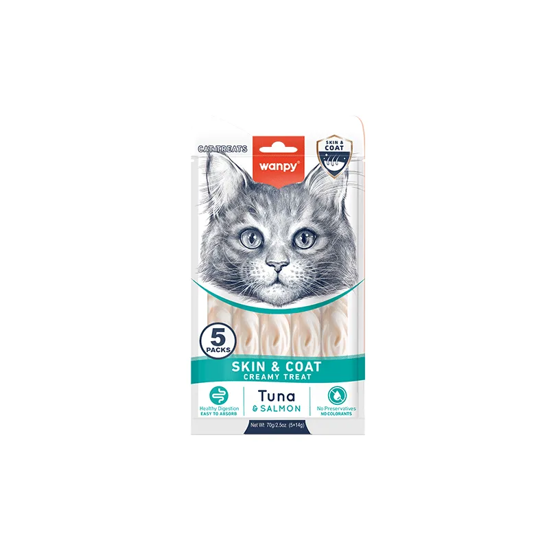 The Medicated Wanpy Skin & Coat Creamy Treat is specially formulated to support healthy skin and a shiny coat in adult cats. With the irresistible taste of tuna and salmon, this creamy, lickable treat is packed with essential fatty acids, vitamins, and minerals that help reduce dryness, itchiness, and dull fur.